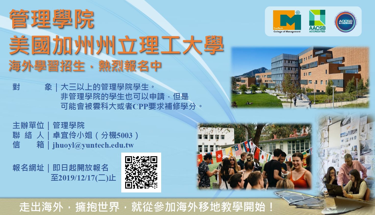 管院舉辦美國加州州立理工大學移地教學,報名截止日到12/17(二),機會難得預報從速。