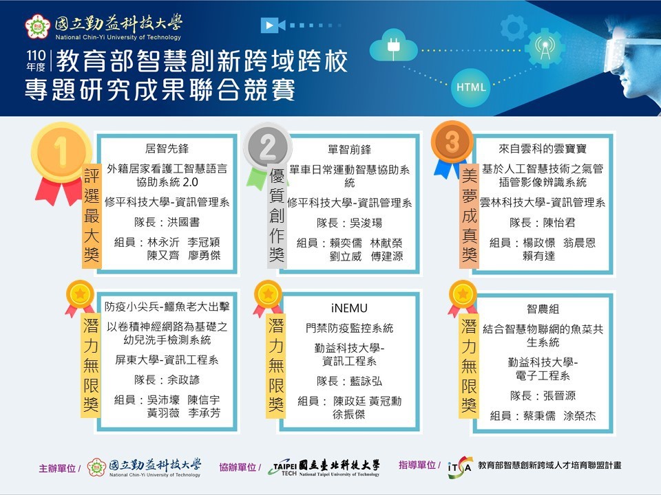 榮獲獎項:110年度教育部智慧創新跨域人才培育計畫跨域跨校專題研究成果聯合競賽 – 第三名