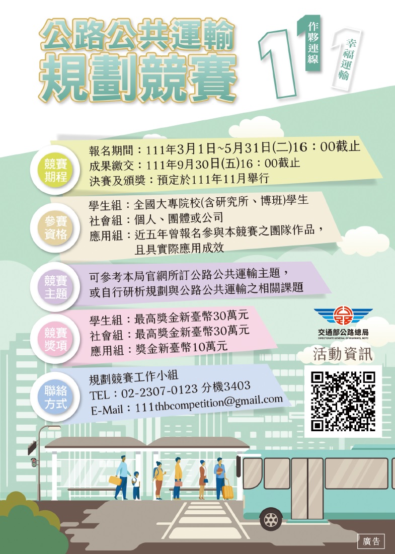 轉發 交通部公路總局 競賽通知: 本局辦理「111年公路公共運輸規劃競賽」,請踴躍報名參加。 活動報名:110/3/1~110/5/31 下午4點截止