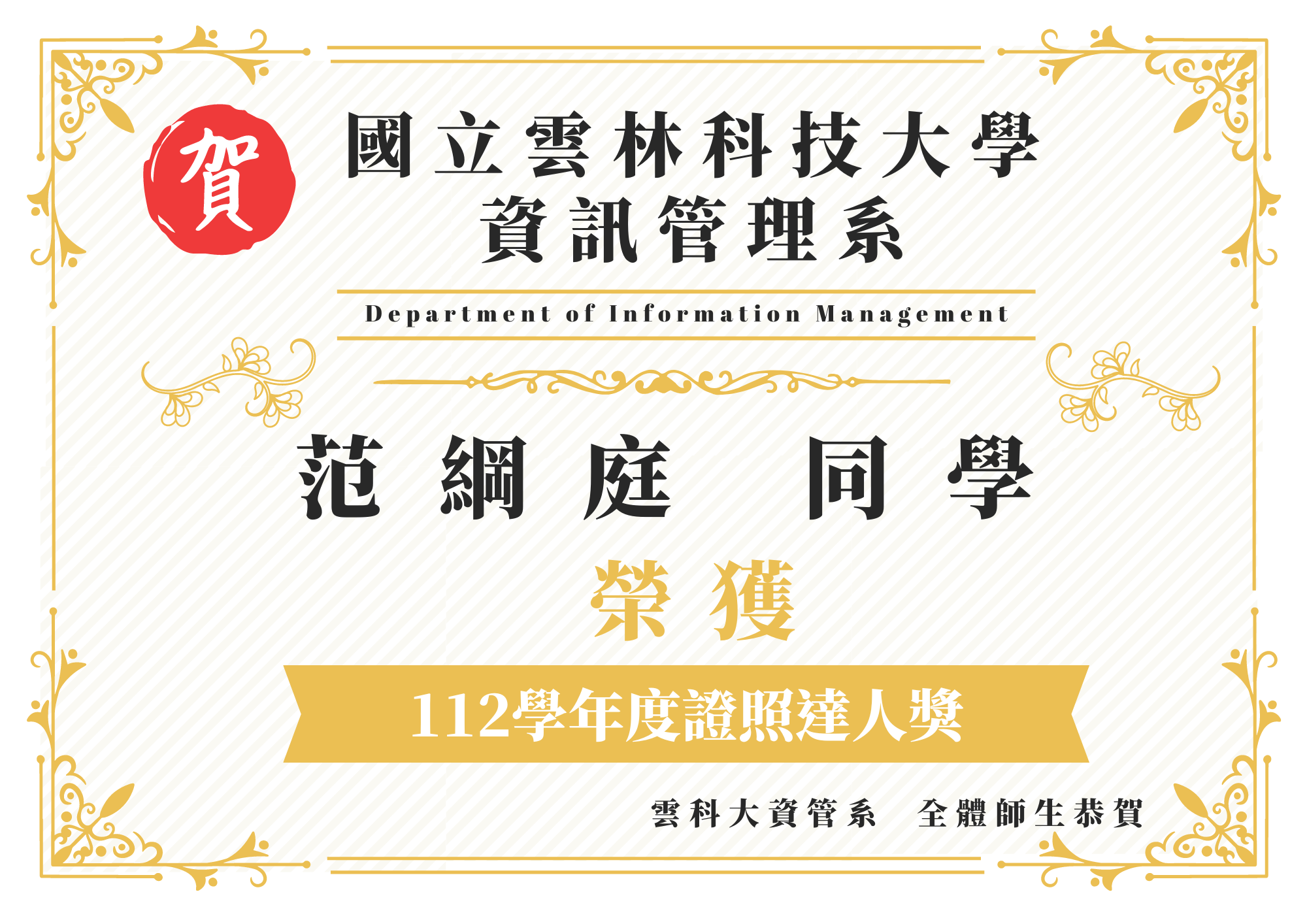 賀!本系范綱庭同學榮獲112學年度證照達人獎